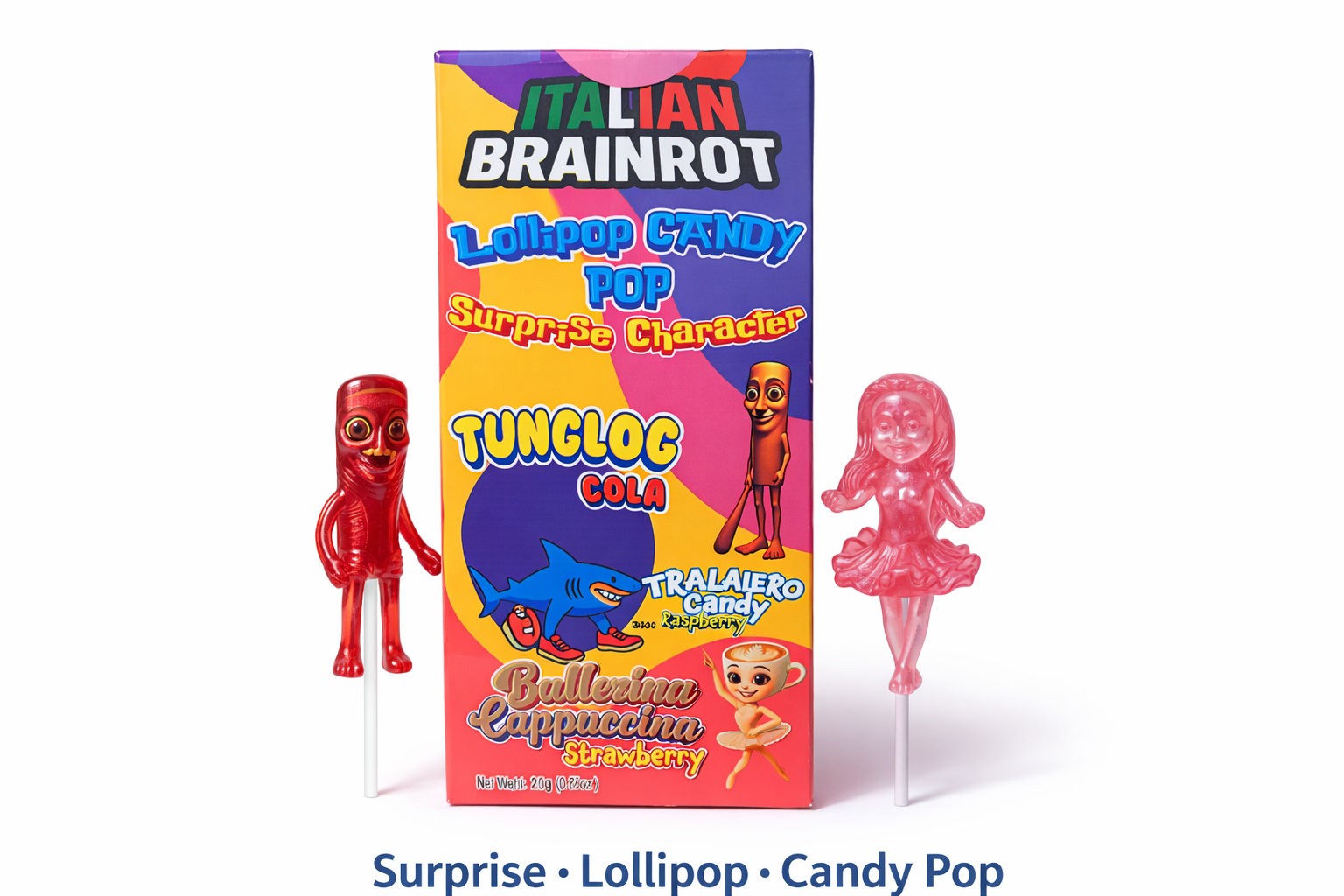 Der Italian Brainrot Surprise Lollipop Candy Pop ist ein bunter Überraschungs-Lutscher mit Kult-Charakteren wie Ballerina Cappuccino, Tunglog, Tralalero und weiteren witzigen Figuren.
